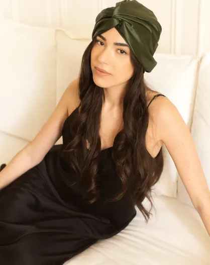 Bonnet de nuit 100% Soie avec lacet réglable vert kaki