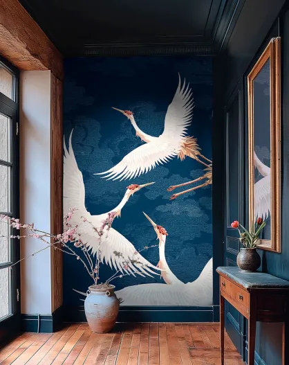 Fresque L'envol du héron Plume Ivoire Fond Bleu nuit - 150x305 cm