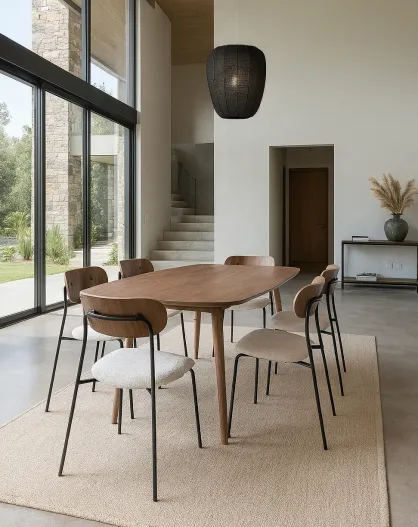 Ensembre Table Effet Bois Couleur Noyer + 6 Chaises Tissu Écru Callao