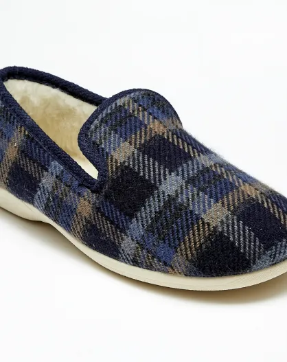 Chaussons charentais fourrés Laine tartan marine bord bleus