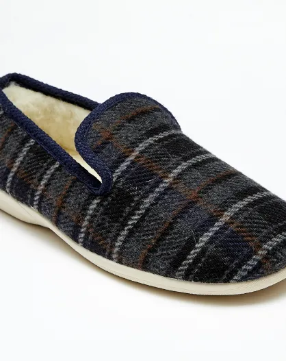 Chaussons charentais fourrés Laine tartan marine bord bleus
