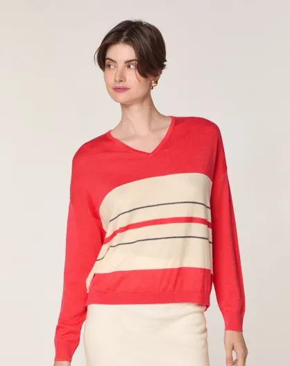 Pull en Laine & Cachemire Sadi marinière col rond écru/orange
