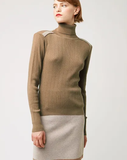 Pull Chantal-Marie col roulé motifs épaules marron camel