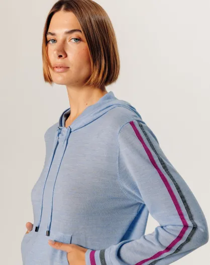 Pull Jocelyne 100% laine capuche tricolore bleu ciel