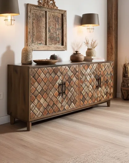Buffet haut bois sculpté motif géométrique 4P Manguier Maglan Beige - 92x40x110 cm