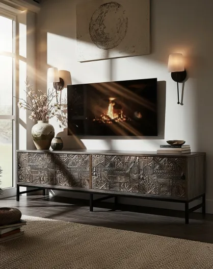 Hawaï - Meuble TV noir en manguier massif sculpté 160 cm