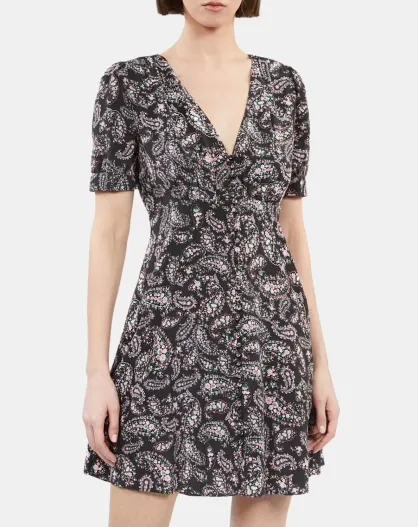 Robe courte imprimée avec boutonnage en soie noire et rouge