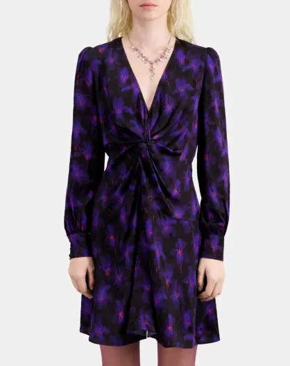 Robe courte fleurie avec drapé noire, rose clair et bleue
