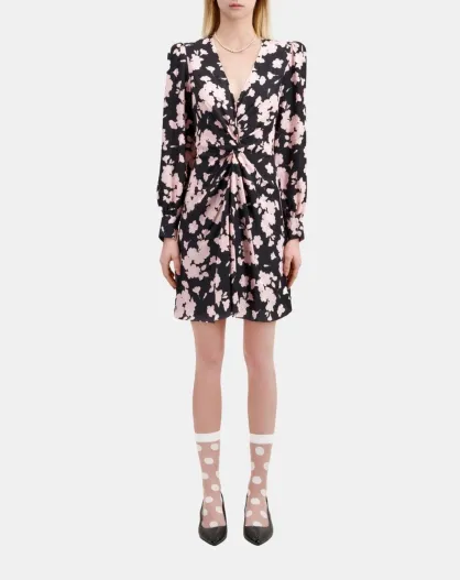 Robe longue fleurie avec drapé noire et rose