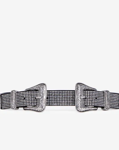 Ceinture en cuir avec strass et double boucle Western argenté antique