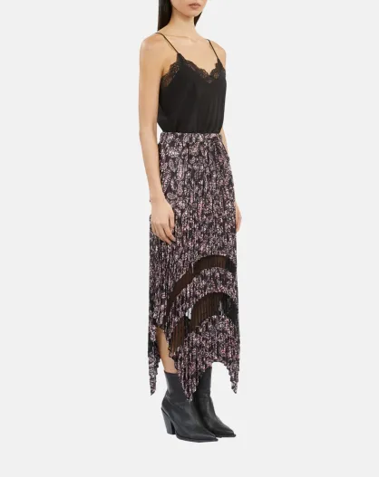 Jupe longue plissée imprimée noire et rose