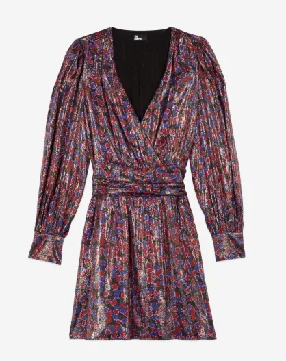 Robe courte fleurie à reflets métallisés bleu et rouge