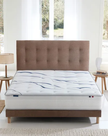 Ensemble matelas mousse HD NUVIA + sommier + tête de lit, chenille bouclettes Moka - 140x190 cm