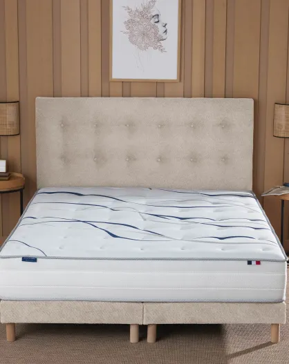 Ensemble matelas mousse HD NUVIA + sommier + tête de lit, chenille bouclettes Crème - 160x200 cm
