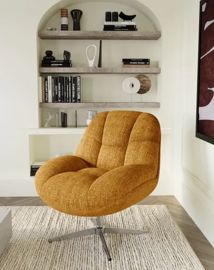 Fauteuil pivotant pied chrome REV velours tramé moutarde – 76x85x91cm