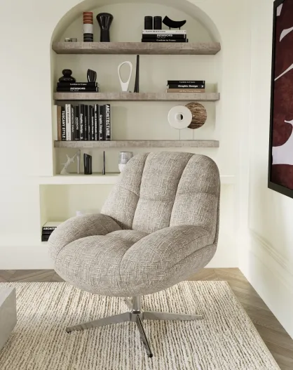 Fauteuil pivotant pied chrome REV velours tramé taupe – 76x85x91cm