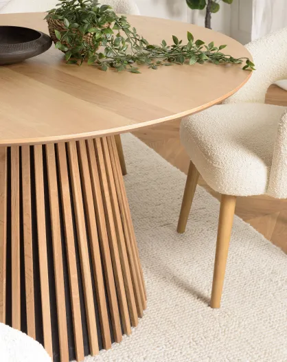 Table à manger ronde D120 décor et chêne naturel pied à motif strié