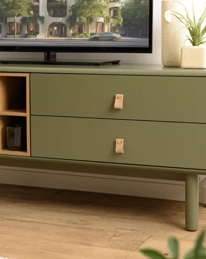 Meuble TV vert 1 porte/ 2 tiroirs et 2 niches en bois naturel