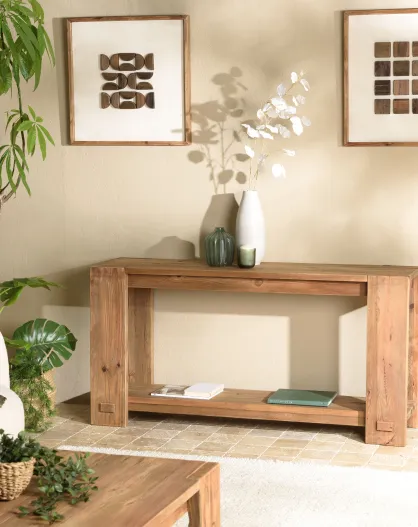 Console arrondie couleur naturelle 2 tiroirs pieds métal noir