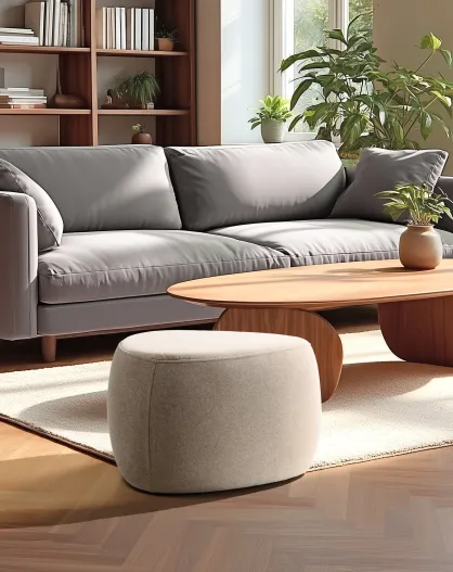 Pouf en tissu effet laine beige et pieds bois