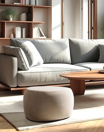 Pouf en tissu effet laine beige et pieds bois