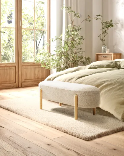 Banc en tissu effet laine beige et pieds bois