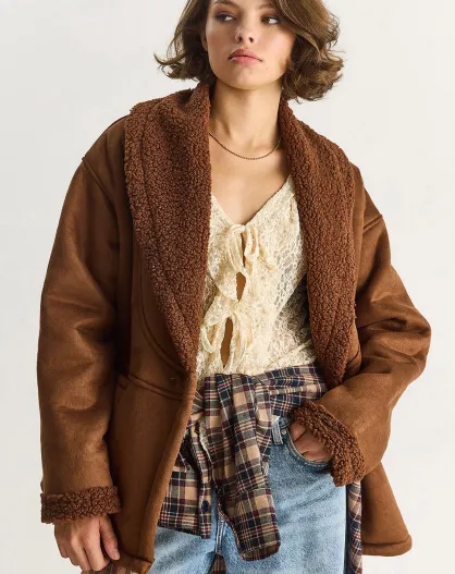 Manteau en daim avec poches en fausse fourrure et col châle brune