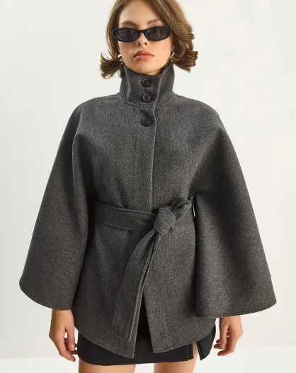 Poncho en laine mélangée ceinturé à col montant anthracite