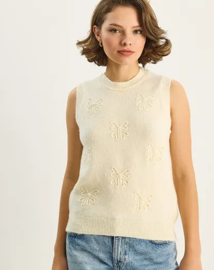 Pull sans manches à col roulé mi/long avec détails en pierre crème