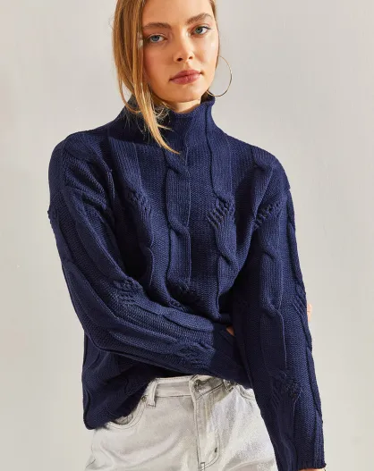 Pull à col montant en grosse maille avec motif tressé bleu marine