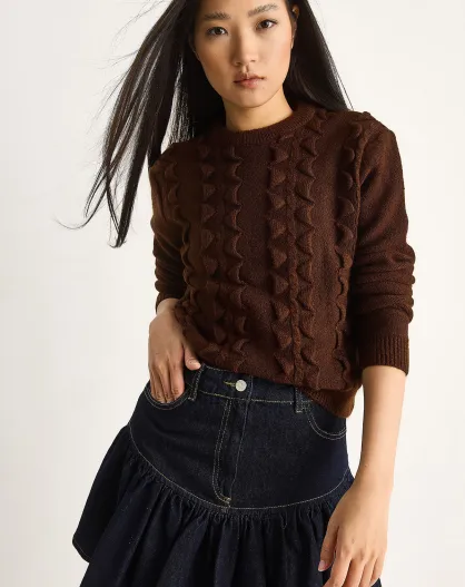 Pull en maille douce à volants col rond brun amer