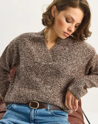 Pull en maille bouclée texturée à col V brun