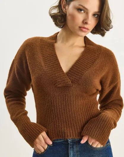 Pull en maille côtelée à col V camel