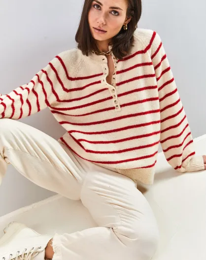 Pull à col roulé rayé avec col boutonné beige/rouge