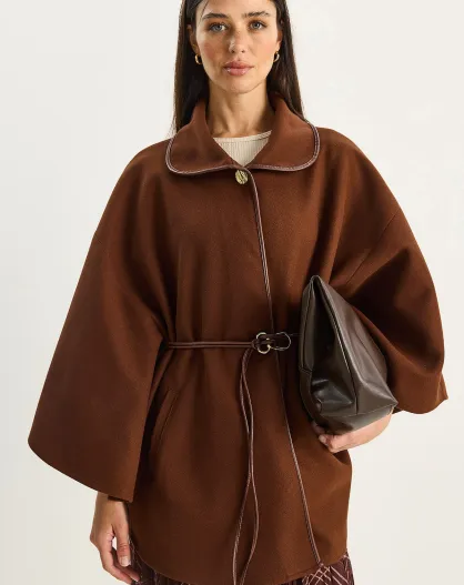 Manteau en daim avec poches en fausse fourrure et col châle brune