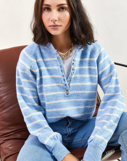 Pull à col roulé rayé avec col boutonné bleu bébé
