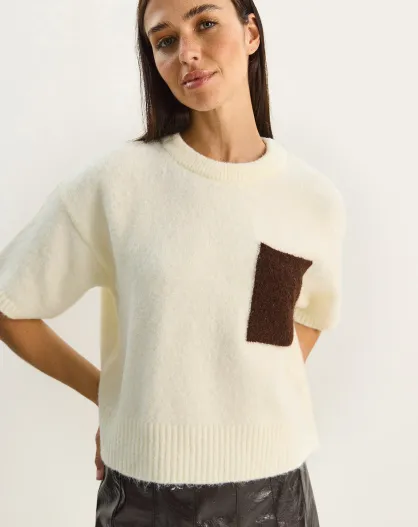 Pull en maille à manches courtes color block avec poches crème