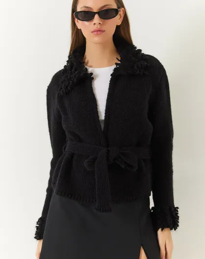 Gilet cardigan en maille à franges avec col et poignets noir