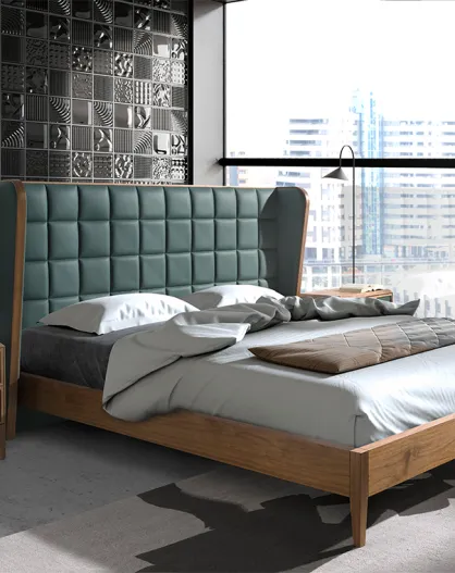 Lit double avec tête de lit originale en similicuir vert foncé/noyer - 135x206x213 cm
