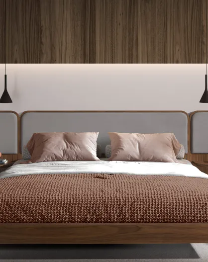 Lit double avec tête de lit originale gris/noyer - 52x172x216 cm
