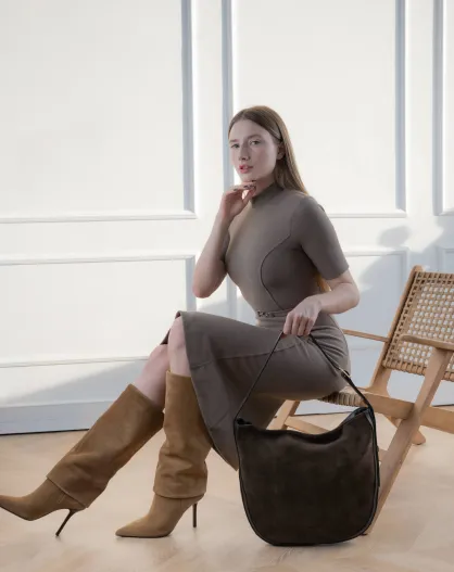Sac porte épaule en Velours de Cuir Moss Moka - 39x33x6 cm