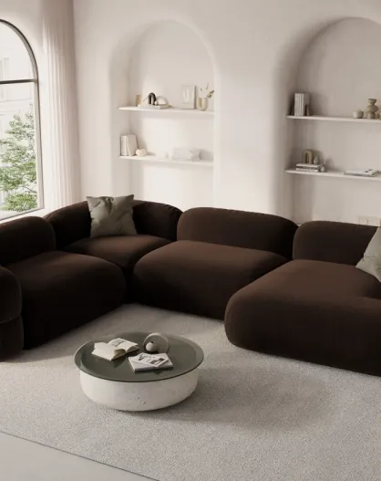 Canapé D'Angle Gauche Panoramique Modulable En Velours Lony 5 Places Chocolat - 345x250x68 cm