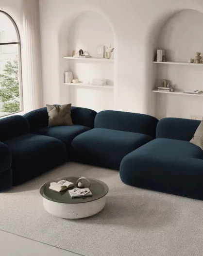 Canapé D'Angle Gauche Panoramique Modulable En Velours Lony 5 Places Pétrole Profond - 345x250x68 cm