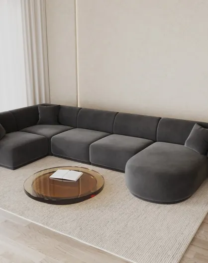 Canapé D'Angle Panoramique (Côté Gauche) Velours Jane 6 Places Gris Foncé - 336x166x74 cm