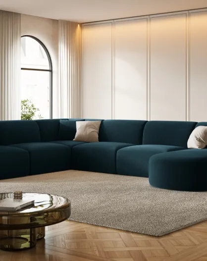 Canapé D'Angle Droit Panoramique Modulable En Velours Talia 7 Places Pétrole Profond - 330x255x70 cm