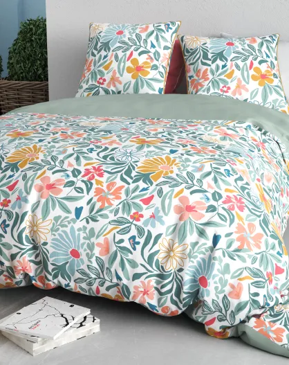 Parure housse de couette en satin de cotonThelma imprimé verte