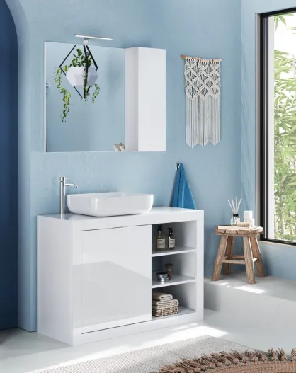 Bari - Meuble salle de bain suspendu Blanc laqué Brillant - 2 portes + 2 niches + vasque à poser - 110x47x45 cm