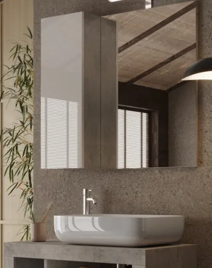 Ancona - Miroir Led avec Colonne Integrée 1 porte H30 cm Béton & laqué brillant - 110x75x18 cm