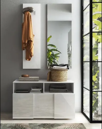 Damiano - Set de Meuble d'entrée Laqué Blanc brillant - comprenant 3 pieces : Meuble a chaussure + Miroir + porte manteau - 91x165x36 cm