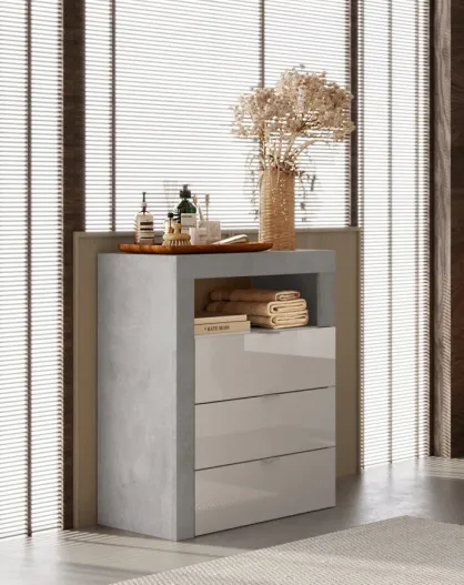 Ancona - Meuble de rangement salle de bain 3 tiroirs effet béton façade blanc laqué brillant - 64x78x35 cm